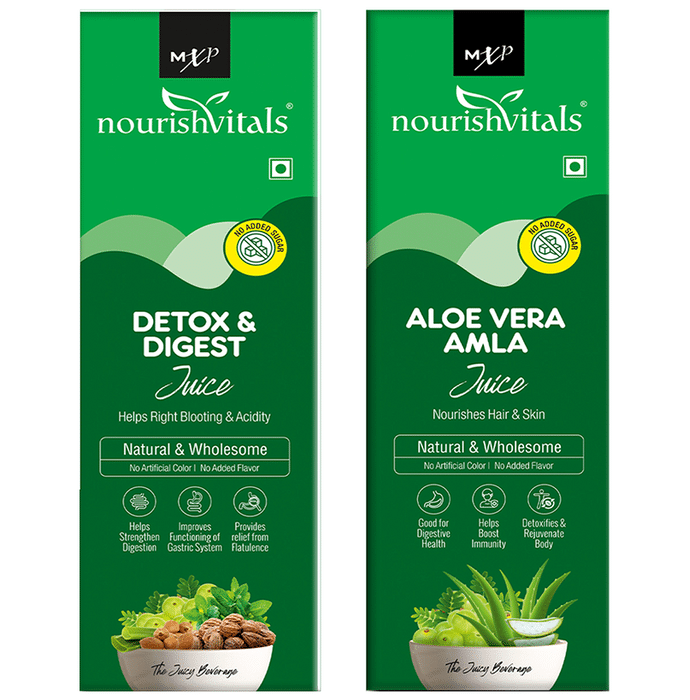NourishVitals Combo Pack of Detox & Digest and Aloe Vera Amla Juice (500ml Each) Aloe vera amla juice is good for overall health and has no added sugar or flavours. It is good for your digestive health and is a natural way to improve immunity. It can also nourish your skin and hair. Aloe vera and amla juice improve metabolism and digestion to help in weight loss. It also acts as a natural detoxifier to cleanse your system from the inside. The detox and digest juice has no artificial flavours or preservatives. It is beneficial for bloating and acidity. It helps to strengthen the digestive system. | Key Ingredients Aloe vera juice Amla juice Jeera juice Ajwain juice | Key Benefits: Amla and aloe vera juice is a great source of vitamins A and C and minerals such as calcium which help in fulfilling your nutrition goals It has anti-ageing properties that may keep your skin and hair healthy It can also boost immunity. It also detoxifies and cleanses your system from the inside It has no added sugar and is good for your digestive health It is beneficial for bloating and acidity It helps to strengthen the digestive system | Directions For Use: Mix 30mL of juice in a glass of water Gulp it down on an empty stomach to get a strong immunity | Safety Information: Store in a cool and dry place away from direct sunlight Read the label carefully Keep out of reach of children Use under medical supervision
