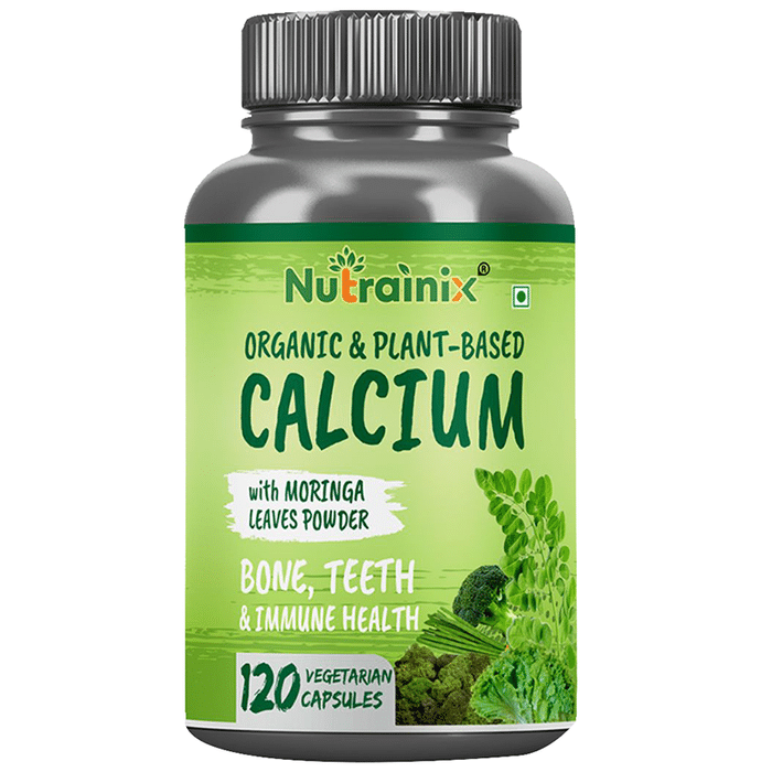 Nutrainix Organic & Plant-Based Calcium with Moringa Leaves Powder Vegetarian Capsule contains calcium which is essential for the growth and development of healthy bones. Does not contain GMOs, soy, gluten, yeast, dairy, eggs, corn, nuts, caffeine, colouring, preservatives, or flavouring | Key Ingredients: Calcium Moringa leaves | Key Benefits: It is used to help reduce the risk of osteoporosis in men and women over the age of 40 It helps in maintaining bone density It helps in providing enough calcium for the formation of healthy bones and teeth It helps in increasing absorption of calcium and phosphorus required for strong bones | Directions For Use: As a dietary supplement take 1 capsule twice daily with water at mealtime, or as directed by your qualified healthcare professional. | Safety Information: Read the label carefully before use Store in a cool dry place away from direct sunlight Keep out of reach of the children