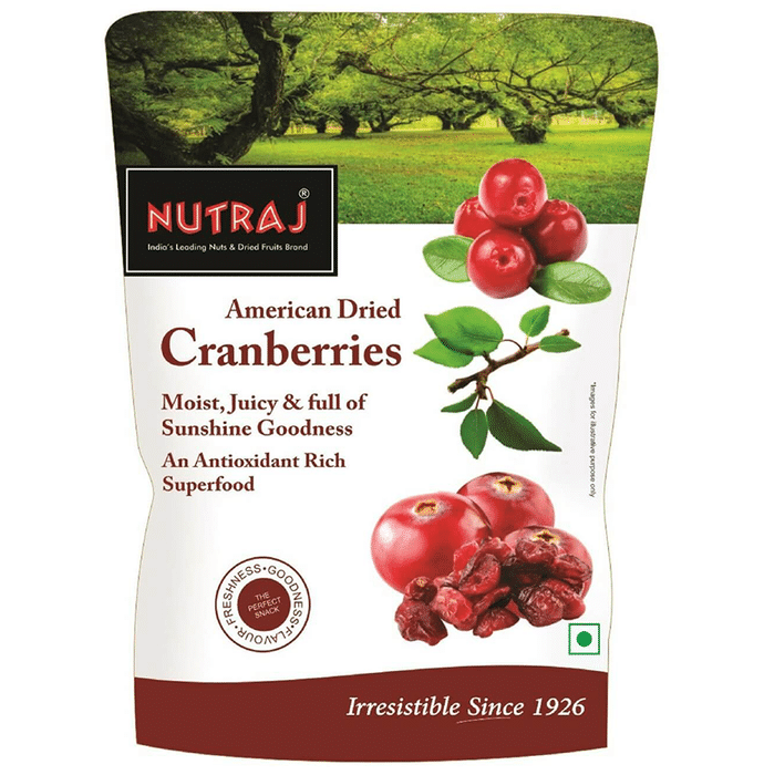 Nutraj American Dried Cranberries is enriched with anti-inflammatory and antioxidant properties. Cranberries have an impressive source of dietary fibre in them. 250 mg of Omega-6 fatty acids and 12.8 mg of Omega-3 fatty acids are both present in each serving of 40 grammes. It offers many anti-inflammatory advantages, including those of vitamin C, vitamin K, carbs, proteins, choline, and niacin. It keeps you healthy and gives your body proper nutrition. It aids in defending you from several bacterial infestations. Its flavour is sweet and tangy, which makes it perfect for enhancing the flavour of cereals. | Key Ingredients: Sweet and tart sliced cranberries | Key Benefits: It provides adequate nutrition to your body as it contains a modest amount of vitamins and dietary fibers It is anti-microbial and hence helps the body fight against viruses It also includes the goodness of omega-6 and omega-3 fatty acids in it which in promoting a healthy body | Directions For Use: Use as a snack | Safety Information: Read the label carefully before use Store in a cool and dry place, away from sunlight Keep out of reach of children under the age of 5