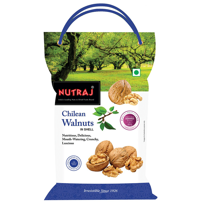 Nutraj Chilean Walnuts are healthy snack that has immense health benefits. They are plant-based, purely vegetarian and do not contain any GMOs. Walnuts (Akhort) are suitable for the skin as they contain vitamin B. Walnuts with omega-3 fatty acids, fibre, vitamins and minerals known to reduce heart disease risk diseases. The outer shell protects and provides natural freshness. Crack them for snacking or use in recipes just when you want them. | Key Ingredients Walnut In Shell | Key Benefits It can help reduce bad cholesterol and increases blood flow to the heart Vitamin B in walnuts can help promote good skin It contains antioxidants that can help prevent inflammation in the body Regular consumption of walnuts can help control diabetes Walnut with omega-3 fatty acids, fibre, vitamins and minerals known to reduce the risk heart disease | Directions For Use Ready-to-eat or can be mixed. Use as per your requirement. | Safety Information Read the label carefully before use Do not exceed the recommended dosage Store in a cool, dry and hygienic place in an air-tight container