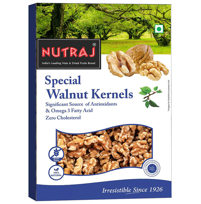 Nutraj Special Walnut Kernels Nutraj Walnuts kernels (Akhort) are healthy snack that has immense health benefits. They are plant-based, purely vegetarian and do not contain any GMOs. Walnuts (Akhort) are suitable for the skin as they contain vitamin B. Walnut with omega-3 fatty acids, fibre, vitamins and minerals known to reduce the risk of heart disease.