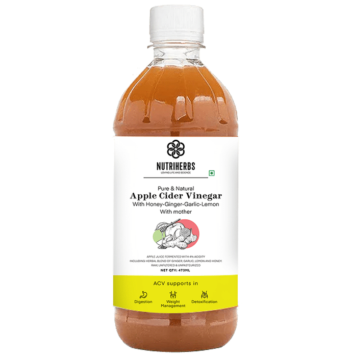 Nutriherbs Honey Ginger Garlic Cider Vinegar has many health benefits and with honey, ginger and garlic ferments they provide increased benefits due to the presence of active enzymes and minerals. Pure Natural Honey Ginger Garlic Cider Vinegar has the ability to aid treatment of various common ailments and health problems. | Key Ingredients: Honey Ginger Garlic Juice | Key Benefits: Ginger juice and garlic helps to kill the bacteria in the mouth and eliminates bad breath Provides relief from swelling, irritation and aids in the process of proper digestion Presence of volatile substances may help in treating chronic indigestion Provides relief from severe cold and treats irritation in the throat It helps to eliminate mucus and congestion in the lungs Due to its enzymatic activity, it promotes the circulation of nutrient in blood and reduces the toxic compounds in the body Helps in clearing skin blemishes, acne and reducing inflammation Natural remedy that helps to slow oxidation of cholesterol level, increases HDL cholesterol and thins the blood Beneficial in reducing arthritis inflammation in the body and provides relief from pain due to its anti-inflammatory properties Anti-oxidant properties reduce the duration of infection thus strengthens the immune system Helps to increase the metabolism and reduce weight faster It is unfiltered and unprocessed vinegar | Directions For Use: Consume 2 teaspoons of Honey, ginger and garlic vinegar daily after diluting it with one glass of lukewarm water. | Safety Information: Read the label carefully before use Store in a cool dry place away from direct sunlight Don't consume directly, dilute with water first Keep out of reach of children Pregnant and lactating women should strictly avoid using this vinegar No need to consume this vinegar in case of liver, kidney and cardiac disorder