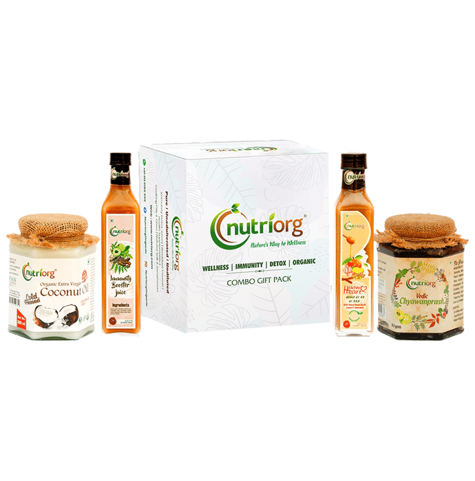 Nutriorg Cardio Companion Kit is the complete care for cardiac health. It is made with organic and natural ingredients to keep the heart healthy as well as strengthen immunity. | Key Ingredients: Ginger Neem Honey Gritha Patala Agnimantha Gambhari Tulsi Coconut oil Turmeric Apple cider vinegar | Key Benefits: Nutriorg Vedic Chyawanprash is rich in antioxidants & 54 immunity-boosting and healing herbs It is made with honey to fight throat infections and soreness Extra virgin coconut oil helps improve the digestive system for the absorption of essential nutrients Apple cider vinegar triggers metabolism and boosts immunity | Directions For Use: Take 15ml-20ml of the Nutriorg immunity booster and healthy heart apple cider vinegar each Mix with 200 ml normal or lukewarm water Take 1 tsp of chyawanprash in the morning and evening with milk Use coconut oil as salad dressings or consume 1 tsp in the morning Adults 2-3 teaspoons, children 1-2 teaspoons twice daily Consume twice a day preferably | Safety Information: Read the label carefully before use Keep out of reach of children Store in a cool and dry place away from direct sunlight Use under medical supervision For external use only