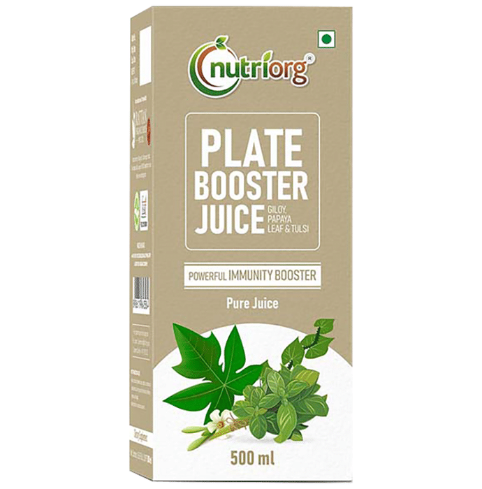 Nutriorg Plate Booster Juice Nutriorg Plate Booster Juice is pure and unadulterated with a unique combination of 10 herbs, including giloy, papaya leaf, aloe vera, ginger, tulsi, mulethi, black pepper, turmeric, ashwagandha and neem. Nutriorg plate booster juice is made from herbs cultivated in the company-owned certified organic farmlands. Papaya Leaf is rich in enzymes which may aid in digestion. It can help in the generation of platelets in the blood. Nutriorg plate booster juice may help eliminate toxins from the body and build a stronger immunity system. Regular consumption of the Nutriorg plate booster may help in improving platelets and building immunity.