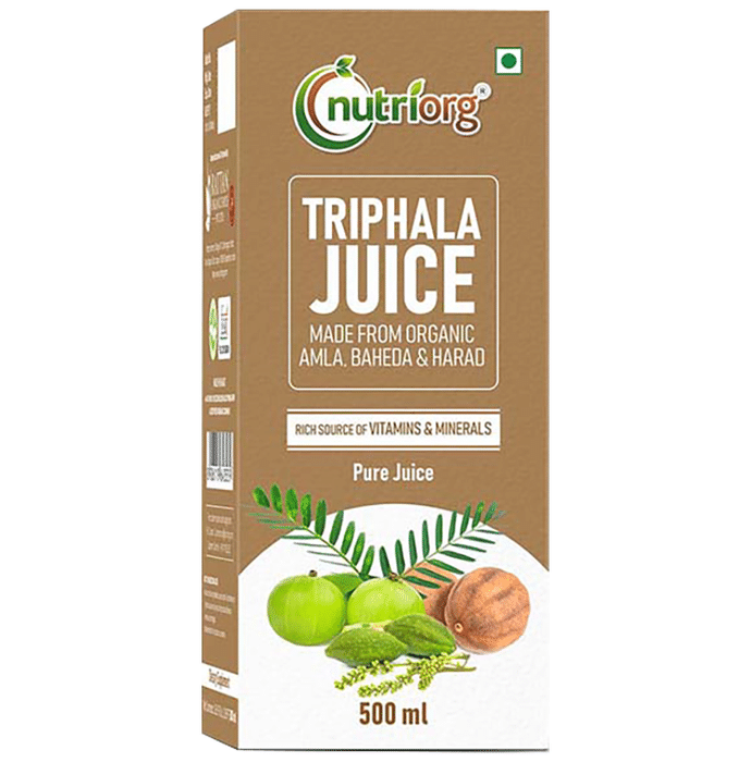 Nutriorg Triphala Juice Triphala has many properties that give endless benefits to the human body. Ayurveda has gifted the world a natural detox formula from triphala juice. The word triphala is derived from ‘tri,’ meaning three, and ‘phala’, meaning fruit. It is derived from amla (Indian gooseberry), a naturally rich source of vitamin C, and can balance all the doshas. It has bibhitaki, which is crucial for bone formation and may prevent numerous ailments, and haritaki, which is beneficial for the heart and brain. It is a natural laxative. When mixed, these three form a powerful ‘rasayana’ called triphala. Triphala is loaded with antioxidants. Ayurvedic practitioners prescribe it for various ailments, including strengthening the immune system, promoting oral health, and managing fatigue. | Key Ingredients: Triphala | Key Benefits: Nutriorg can help maintain overall health It may detoxify the body as it is a natural laxative and thoroughly cleanses the body of waste It can balance all the doshas and manage fatigue It can help maintain healthy heart and brain functions | Directions For Use: Mix 20 - 30 ml of Nutriorg triphala juice in 200 ml of lukewarm water in a non-metallic pot and consume on empty stomachs twice a day, preferably morning and evening. | Safety Information: Read the label carefully before use Store in a cool, dry place away from direct sunlight Keep out of reach of the children Use under medical supervision