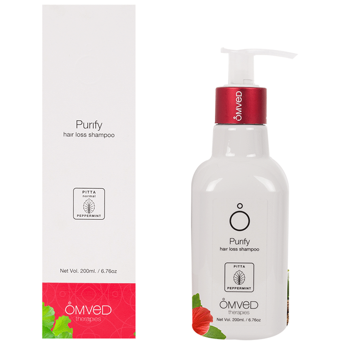 Omved Therapies Purify Hair Loss Shampoo This shampoo contains hyaluronic acid, pro-vitamin B5, and wheat protein which may help stimulate hair growth, reduce hair loss, and improve hair volume. It is free from sulphates, parabens, glycols, or silicones. It can also make the hair feel thicker and less prone to breakage. | Key Ingredients: Aloevera juice Gotukola extract Jatamansi extract Hibiscus extract Licorice extract Vegetable glycerin Hydrolysed Pea protein Hydrolysed Wheat protein Vegan Hyaluronic acid | Key Benefits: | Nourish roots: The amino acids, antioxidants, vitamin C and B5 can help strengthen hair roots and prevent breakage or damage due to heat and damaging products or environmental damage | Hair growth: The naturally derived ingredients, proteins and minerals work together to remove buildup and unclog hair roots to support hair growth | Cleanse without stripping: Coconut-derived cleansers in this shampoo help deeply cleanse the scalp to unclog hair roots without stripping off natural moisture | Reduce hair fall: Plant proteins can help strengthen fragile hair and reduce splitting. Vitamin C and plant extracts may support DHT reduction, remove residue, and aid in strengthening hair roots and follicles to reduce hair fall and damage | Directions For Use: Massage into wet hair and scalp for 1-2 minutes and work into a gentle lather Rinse and repeat if desired. Follow with Omved conditioner | Safety Information: Read the label carefully before use Store in a dry place