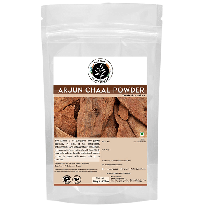 Organic Ayurvedistan Arjun Chal Powder can help reduce the risk of cardiac ailments and offers many benefits for skin health. It helps strengthen heart muscles, regulates cholesterol, and lowers blood sugar levels for the proper functioning of the heart. Arjuna has astringent properties and may aid in combatting Vata and Pitta related skin problems like eczema, psoriasis, itching and rashes. Additionally, this powder helps manage respiratory and bowel related problems. | Key Ingredients: Arjun Bark | Key Benefits: It has antioxidant, antimicrobial and anti-inflammatory properties Helps strengthen heart muscles and reduces the risk of heart diseases Its astringent properties can help alleviate skin problems like psoriasis, itching and eczema Can reduce high blood pressure and manage cholesterol levels Useful for controlling ailments like diarrhoea, asthma and cough | Directions for Use: Use as directed by the physician. | Safety Information: Read the label carefully before use Store in a cool and dry place below 25 C Protect from direct sunlight, heat and moisture Keep out of reach of the children