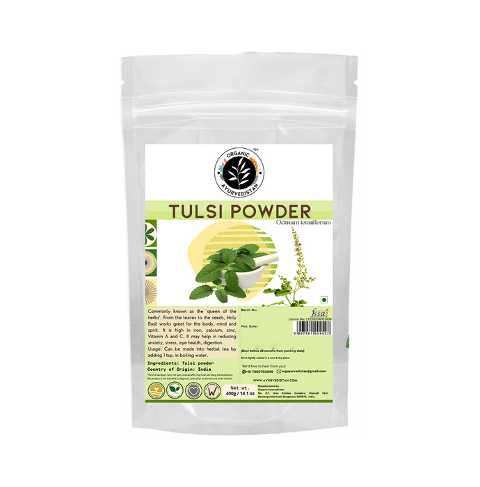 Organic Ayurvedistan Tulsi Powder is formulated with the Ayurvedic herb Tulsi. It has antimicrobial, anti-allergic, and anti-inflammatory properties. It is beneficial in treating Asthma, Bronchitis, cough, and flu and also helps in regulating cholesterol levels. It helps in detoxification of the body and also provides relief from stress. It has antioxidant properties and is also useful in boosting natural immunity. | Key Ingredient: Tulsi Extracts | Key Benefits: Helps in relieving common cold, cough, and flu Useful in treating Asthma and Bronchitis It helps to detoxify the body Helps in preventing damage caused by toxic chemicals Improves the natural immunity level of the body Useful in relieving joint pain and rheumatoid arthritis | Directions For Use: Dosage should be directed by the physician. | Safety Information: Read the label carefully before use Keep out of the reach of children Do not exceed the recommended dosage Store in a cool and dry place