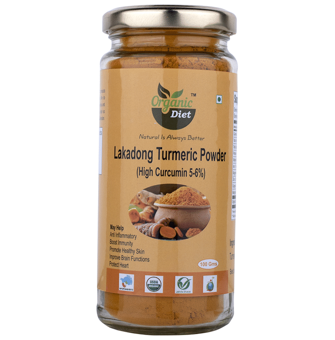Organic Diet Lakadong Turmeric Powder Organic Diet Lakadong Turmeric Powder has high curcumin content, which can help improve overall health. Turmeric has anti-inflammatory properties and can help boost immunity. This product is grown without synthetic pesticides, GMOs, and chemicals.