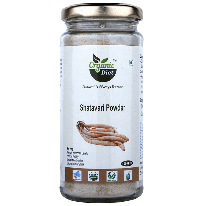 Organic Diet Shatavari Powder is an ayurvedic herb which can help women improve their overall health. It may aid in detoxifying the blood and supporting digestion. This product is grown without synthetic pesticides, GMOs, and chemicals. | Key Ingredients: Shatavari roots powder | Key Benefits: Shatavari may help maintain hormonal balance It may help promote the production of breast milk in lactating women It has antioxidant and anti-inflammatory properties It can boost the immune system | Directions For Use: Take one teaspoon twice daily with 200ml lukewarm water or as directed by the physician. | Safety Information: Pregnant and lactating women are advised to consume herbal products under medical supervision This product is not intended to diagnose, cure, treat, or prevent any disease Store in a cool and dry place away from direct sunlight Consume within a month of opening the pack