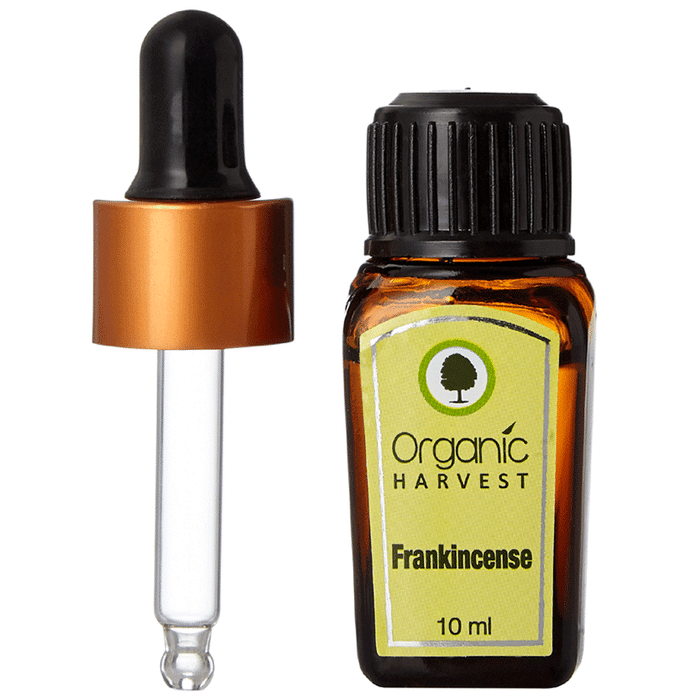 Organic Harvest Frankincense Essential Oil helps in toning skin.It rejuvenates ageing skin, balances and heals the skin. It helps to create peaceful environment. The woodsy, warm and balsamic aroma of frankincense essential oil can also be used for diffusion during meditation for grounding purposes. | Key Ingredients: Pure Frankincense Oil | Key Benefits: Essential oil can be used for diffusion during meditation for grounding purposes It is beneficial for treating open pores Reverses the skin ageing process Works as a daily skin toner Gives your home a spiritual aura | Direction for use If you are using with scrub or lotion, use 6-8ml oil with every 30ml of product Can be used as a fragrance enhancer, use 4-6 drops of oil with aromatherapy diffuser | Safety Information Read the label carefully before use Keep it out of reach of the children Store in a cool and dry place away from direct sunlight Use under medical supervision