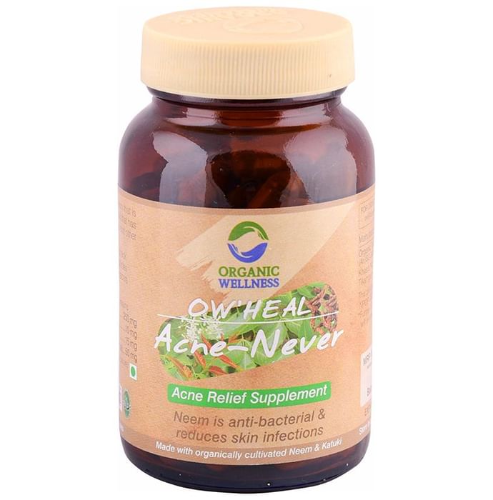 Organic Wellness OW'HEAL Acne-Never Capsule has organic Neem that is an anti-bacterial agent and organic Katuki that has a cooling effect & relieves acne, pimples, and other skin disorders. Salient features of Organic Wellness OW'HEAL Acne-Never Capsule: 100% vegetarian. Ideal for acne, long-standing skin allergies and infections. It is a potent antioxidant, boosts the immune system. Also, it helps the heart by maintaining blood pressure, reducing blood clots and raised cholesterol levels & prevents atherosclerosis. Free from sugar, artificial colors, artificial flavors, preservatives, and gelatin. Direction for use: As directed by the physician. Safety information: Keep out of the reach of children. Use under medical supervision.