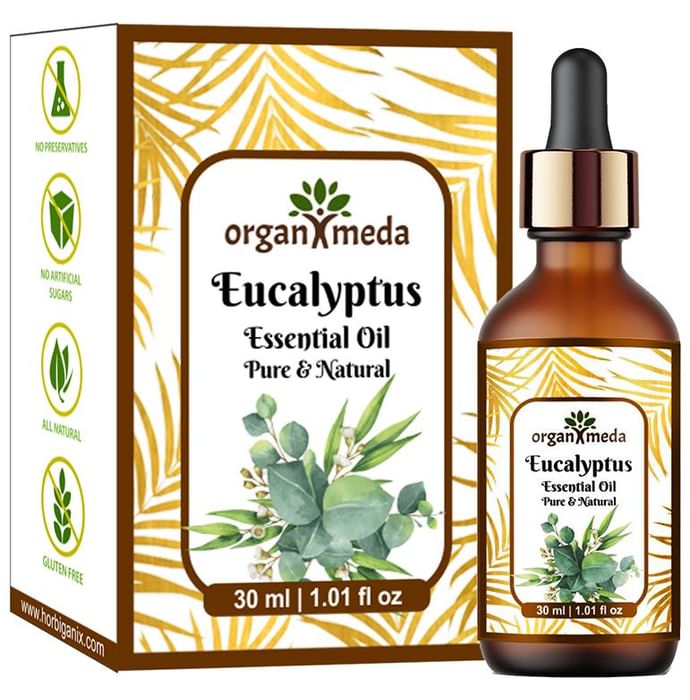 Organimeda Eucalyptus Essential Oil It is ideal for healthy breathing and cough and cold relief. This oil also acts as a natural sunscreen, soothes skin and scalp discomfort, locks in moisture, hydrates and cleanses hair roots, moisturises hair without rendering it greasy and increases hair thickness. | Key Ingredients: Eucalyptus | Key Benefits: Eucalyptus essential oil is excellent for relieving coughs and colds The fragrance of eucalyptus essential oil refreshes the surroundings and relaxes the body Eucalyptus oil helps to give the soft, blemish-free skin you crave | Directions For Use: Use as directed on the label or as advised by your healthcare provider. | Safety Information: Read the label carefully before use Store in a cool and dry place away from direct sunlight Keep out of reach of children