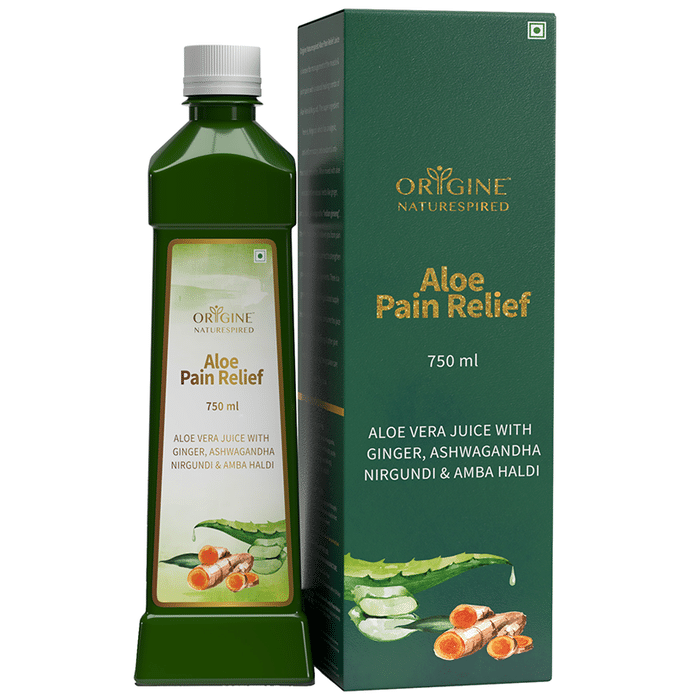 Origine Naturespired Aloe Pain Relief Juice is packed with the goodness of many super herbs that are loaded with various nutrients that help replenish the body. This juice works to help reduce pain, especially rheumatic pain. The drink is loaded with antioxidants that help protect from the harmful free radicals. The antioxidants also works to delay ageing. The many nutrients present also help relieve fever, anxiety and constipation. The drink is made with 100% vegan and cruelty-free ingredients. | Key Ingredients: Ginger Aloevera Ashwagandha Nirgundi Haldi | Key Benefits: It helps in providing relief from pain It helps reduce rheumatic pain It helps with inflammation and fever It works in improving mental health helping relieve anxiety It helps in detoxfying blood and fighting off infections It helps curb harmful free radicals It helps in delay ageing It is good for the gut health as it helps relieve constipation | Direction For Use: Use as directed on the label. | Safety Information: Read the label carefully before use Do not exceed the recommended dosage Store in a cool and dry place away from direct sunlight Keep out of reach of children