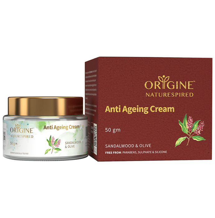 Origine Naturespired Anti Aging Cream is an everyday solution for those wanting to get rid of the different signs of ageing, including wrinkles, fine lines, skin dryness and loss of skin firmness. | Key Ingredients: Sandalwood Argan olive oil Jojoba oil Almond oil Coconut oil Vitamin e Propylene glycol Stearic acid Glycerin | Key Benefits: It is formulated with sandalwood, jojoba and almond It is crafted to enhance the youthful glow of the skin This anti-wrinkle cream is enriched with antioxidants which help to prevent wrinkles, fine lines, scars, dullness, and puffiness naturally It is dermatologically tested and clinically approved It is a natural product which is paraben-silicon-chemicals free | Directions for use: Wash and Cleanse your face properly Apply some dots of origine naturespired's cream forehead, nose, cheeks, and chin Gently massage the cream with your fingers in a circular motion, then upward until absorbed | Safety Information: Avoid direct contact with eyes If contact occurs, splash plenty of water Discontinue use if redness or inflammation occurs