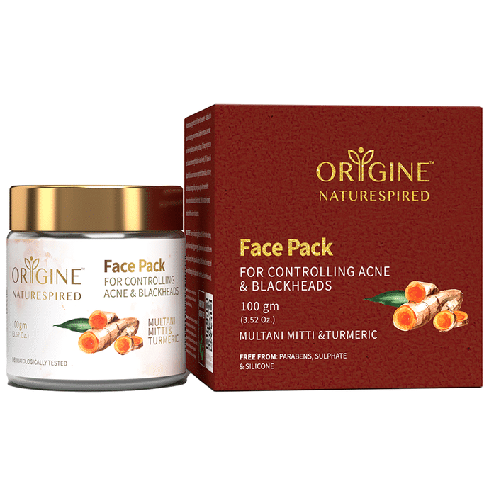 Origine Naturespired Face Pack for Controlling Acne and Blackheads helps get rid of acne and flakiness of the skin. In addition, this face pack is soothing and loaded with anti-bacterial properties to reduce every skin concern effortlessly. This exfoliating face pack is 100% vegan, cruelty-free, and made from paraben-free ingredients to give proper care to the face to naturally reduce acne, spots, and blackheads. It works by locking in the moisture and controlling excess sebum production and blockage. The pack revitalises the skin make it smoother, softer and brighter. | Key Ingredients: Multani mitti Turmeric Neem | Key Benefits: It helps reduce pimples and acne It helps brighten the skin reducing dark spots It soothes the skin It helps control sebum production It helps nourish the skin by seeping deep within It helps prevent clogged pores and keeps them tight and clean It is dermatologically tested and clinically approved It is a natural product which is paraben-silicon-chemicals free | Direction For Use: Use as directed on the label. | Safety Information: Read the label carefully before use Do not exceed the recommended dosage Store in a cool and dry place away from direct sunlight Keep out of reach of children