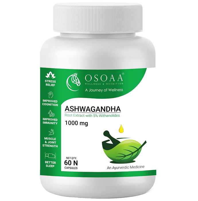 OSOAA Ashwagandha 1000mg Capsule OSOAA Ashwagandha 1000mg Capsule is an Ayurvedic capsule with 5% standardised ashwagandha root extract. It can help improve cognitive function and immunity.