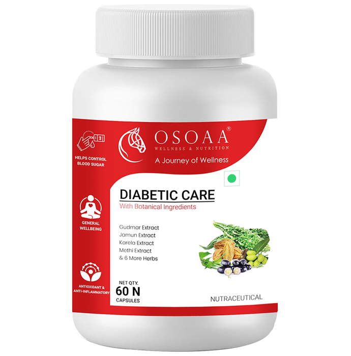 OSOAA Diabetic Care Capsule is a health supplement with potent botanical ingredients with antioxidant and anti-inflammatory properties. It helps control blood sugar and provides diabetes care. | Key Ingredients: Jamun extract Karela extract Neem extract Methi extract | Key Benefits: It helps control blood sugar It helps maintain healthy insulin levels It may help lower bad cholesterol in the body It can help enhance liver function It can help boost immunity | Directions For Use: Consume one capsule twice a day before meals | Safety Information: Read the label carefully before use Store in a cool and dry place, away from sunlight Keep out of reach of children