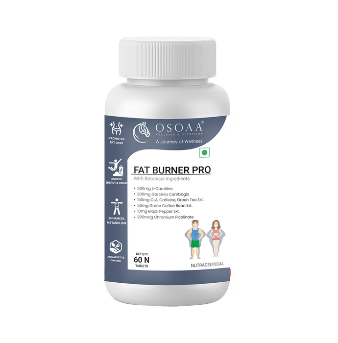 OSOAA Fat Burner Pro Tablet is a health supplement that enhances metabolism and promotes fat loss. This tablet provides antioxidant support and can help improve energy and focus. | Key Ingredients: L-cartnine Garcinia cambogia Caffeine | Key Benefits: It helps enhance fat loss and boosts fat metabolism It can help control appetite and suppress hunger It helps convert fat into energy It helps increase the calorie-burning capacity of the body | Directions For Use: Consume one tablet twice a day or as directed by a healthcare professional | Safety Information: Read the label carefully before use Store in a cool and dry place, away from sunlight Keep out of reach of children