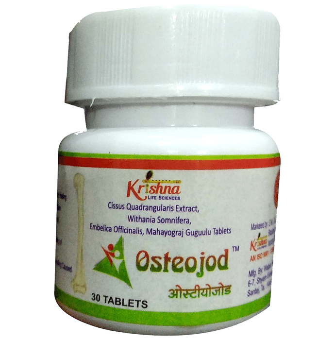 Osteojod Tablet is a health supplement that can help support bone and teeth health. | Key Ingredients: Cissus Quadrangularis extract Withania Somnifera extract Embelica Officinalis Sastriya yog | Key Benefits: Cissus quadrangularis can help relieve joint pain and inflammation Withania somnifera may be effective in lower back pain, arthritis, joint, and nerve pain Amla can aid in reducing inflammation and cramps Mahayograj guggal has anti-inflammatory properties | Directions For Use: 1 tablet 2 times a day or as directed by the healthcare professional. | Safety Information: Read the label carefully before use Store in a cool and dry place Keep out of reach of children
