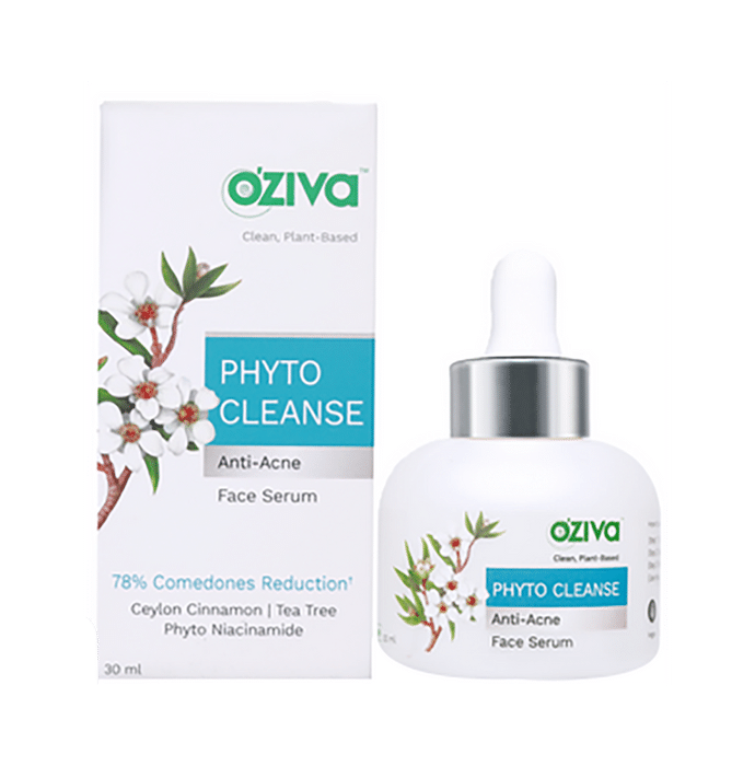 Oziva Phyto Cleanse Anti-Acne Face Serum It helps exfoliate the skin to give acne-free and hydrated skin. It helps clear extra sebum and impurities. It is easily absorbed into the skin to heal and hydrate it from within. | Key Ingredients: Ceylon cinnamon Tea tree Tulsi | Key Benefits: Helps clear extra sebum and impurities The unique formulation is easily absorbed for oil-balancing This face serum helps provide blemish-free and hydrated skin Tea tree oil heals acne lesions and calms inflammation | Directions For Use: Apply evenly over face and neck area Leave on for 10-15 mins Gently remove with a damp face cloth | Safety Information: Read the label carefully before use Store in a cool and dry place away from direct sunlight Keep out of reach of children