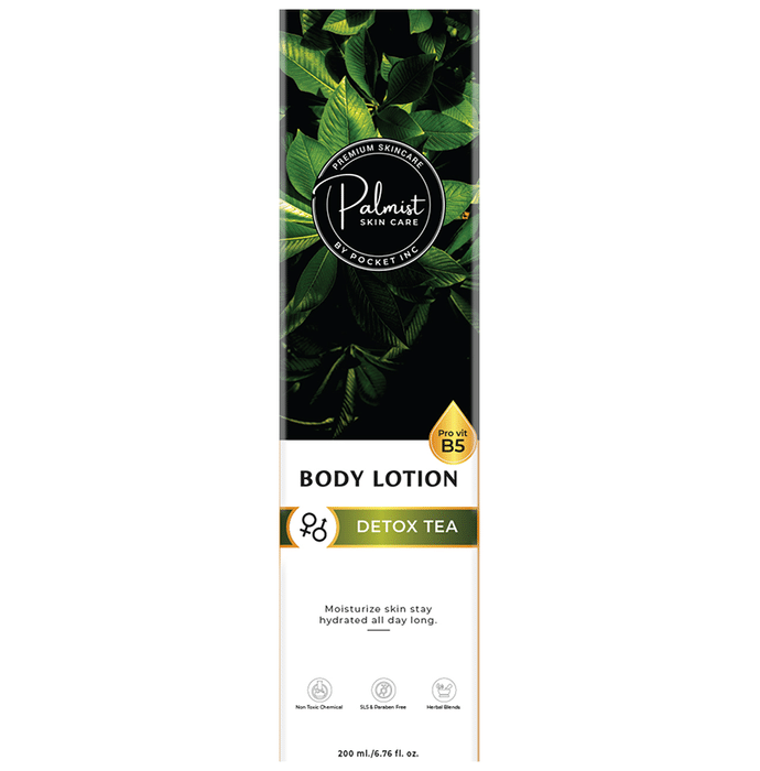 Palmist Body Lotion Detox Tea This skin-loving body lotion comfort protects and restores dry skin. Enriched with the goodness of vitamin E, it provides optimal nourishment and is specially formulated for sensitive and dry skin. It is designed using ingredients that work together to deal with the dryness of the skin. It helps treat any damage caused by the dryness on the surface of the skin. | Key Ingredients: Tea Tricticum sativum Cocos nucifera Ocimum sanctum | Key Benefits: This product is paraben-free, dye-free, essential oil-free, cruelty-free, vegan and dermatologist tested It also helps to heal dry skin with long-lasting moisture to instantly boost the skin's natural radiance The lotion is formulated to provide ultra-light, non-greasy, soothing and long-lasting hydration with intensive anti-ageing qualities This skin-loving body lotion comforts protects and calms dry skin and has a long-lasting fragrance Enriched with the goodness of vitamin E, it is specially formulated for sensitive and dry skin This lotion has a non-greasy, quick absorb formulation that gives long-lasting and balanced moisturisation to dry skin | Directions For Use: Use as directed on the label or as advised by your healthcare provider. | Safety Information: Read the label carefully before use Store in a cool and dry place away from direct sunlight Keep out of reach of children
