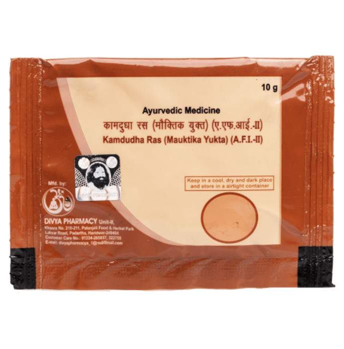 Kamdudha Ras contains Moti Pishti, Prawal Pishti, Mukta Shukti Bhasma, Kaudi Bhasma, Shankha Bhasma, Shuddha Swarn Gairik, Giloy Sat, Moti Pishti, Prawal Pishti, Mukta Shukti Bhasma, Kaudi Bhasma, Shankha Bhasma, Shuddha Swarn Gairik as the combination of an ingredient. The formulation is prepared by an elaborative method by purifying and combining the goodness of natural ingredients and It is very effective in long-lingering ailments. Key benefits/uses of Kamdudha Ras: - Relieves chronic acidity, heartburn, stomach ulcers and colic pains - Used to soothe hyperacidity - Provides cooling relief in ulcers - Stimulates production of digestive enzymes which boosts the digestive system Direction for use/Dosage: - Take the formulation as directed by the physician Indications: - Hyperacidity, ulcers, heartburn and stomach pain - Pittavikar, amlapitta, daha, and raktapitta Storage instructions: Store the formulation in cool and dry place Safety information: - Read the label carefully before use - Do not exceed the recommended dose - Keep out of the reach and sight of children