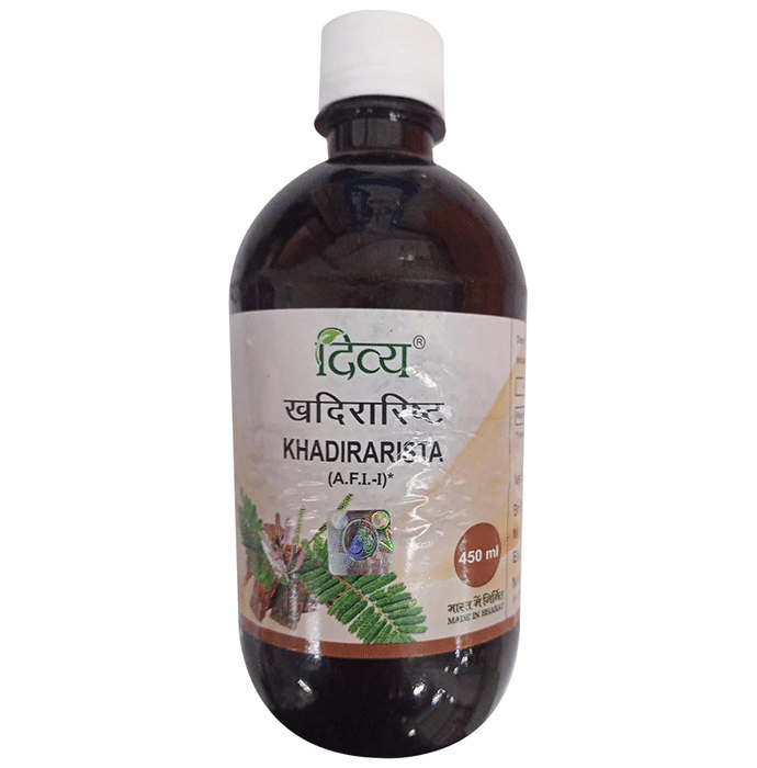 Divya Khadirarishta contains Khair (Acacia catechu), Devdaru (Cedrus deodra), Babachi (Psoralea corylifolia), Daruhaldi (Barberis aristata), Harar (Terminalia chebula), Behara (Terminalia belirica), Amla (Emblica officinalis), Gudd (Jaggery), Sugar, Dhaiful (Woodfordiaf ruticosa), Kankol (Piper cubeba), Nagkesher (Mesua ferrea), Jaiphal (Myristica fragrans), Long (Syzygium aromaticum), Badiela (Amomum sabulatum), Dalchini (Cinnamomum zeylanicum), Tejpatra (Cinnamomum tamala) and Pipal (Piper longum) as a combination of the ingredients. The formulation is an excellent blood purifier which is made from herbal extracts and has no side effects which heal from the inside and gives glowing skin. Key benefits/uses of Divya Khadirarishth: - An effective blood purifier - Antibacterial Ayurvedic medicine - Eliminates toxins and micro-organisms - Improves digestion and cures pimples, acne and other skin problems like cysts Direction for use/Dosage: - Take 15-30 ml of Divya Khadirarishth orally with the equal quantity of water after meals twice a day or as directed by the physician Indications: - Skin disease, cyst, tumor, pimples etc. Storage instructions: - Store the formulation in cool and dry place Safety information: - Read the label carefully before use - Do not exceed the recommended dose - Keep out of the reach and sight of children