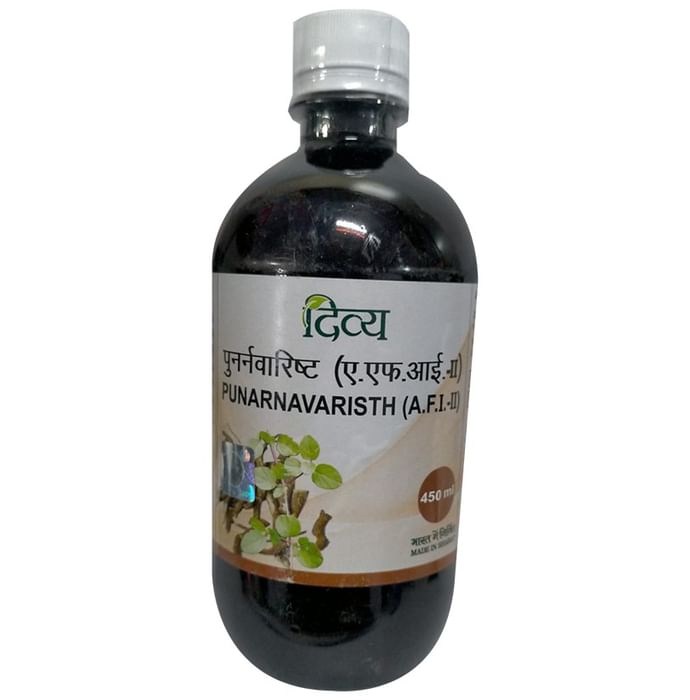 Divya Punarnavarishta contains Shveta Punarnava, Rakta Punarnava, Bala, Atibala, Patha, Vasa, Guduci, Citraka, Nidigdhika, Guda Jaggery, Madhu (Honey), Hema (Nagakeshara), Mesua, Tvak, Ela (Sukshmaila), Marica, Ambu (Hrivera) and Patra (Tejapatra) as a combination of ingredients. - It is a combination of herbal remedies for kidney disease. Key benefits/uses of Divya Punarnavarishta : - Herbal cure for kidney diseases - Used to cure anaemia - Used for treating oedema - Cures liver, abdomen, spleen disorders Direction for use/Dosage: - Take Divya Punarnavarishta orally 15-20 ml with equal qty of water or take as directed by the physician. Indications: - Kidney diseases, abdomen, spleen disorders Storage instructions: - Store the formulation in cool and dry place Safety information: - Read the label carefully before use - Do not exceed the recommended dose - Keep out of the reach and sight of children
