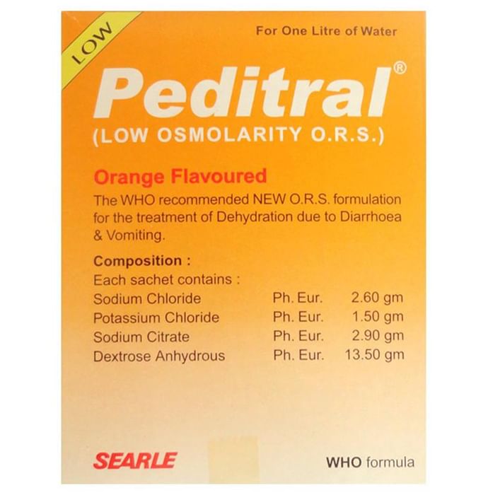 Peditral is a WHO based ORS (Oral Rehydration Salt) formula. Oral redyration salt is a combination of Dextrose and a number of essential electrolytes (Sodium Chloride, Potassium Chloride, Sodium Citrate). Peditral restores body fluids & electrolytes, lost due to dehydration in during Diarrhea, vomiting, muscle cramping, and exertional heat illness, while exercising in hot or humid weather. Role of key ingredients: Sodium Chloride (NaCl) Sodium Chloride are essential in boldy to make fluid balance. Sodium chloride is utilized by body cells for its normal function. Potassium Chloride (KCl) Potassium is an extremely important electrolyte that functions in the maintenance of water balance and distribution, acid-base balance, muscle and nerve cell function, heart function, kidney and adrenal function. Dextrose Anhydrous Dextrose anhydrous is the purest form of dextrose, commonly called glucose. Dextrose anhydrous provides instant energy. It is the primary ingredient in oral rehydration salts (ORS). Trisodium Citrate dihydrate Trisodium citrate dihydrate is a tribasic salt of citric acid. It is produced by complete neutralization of citric acid with high purity sodium source and subsequent crystallization. Direction for use: 1. Empty a pack of electral into the measuring cup 2. Fill the measuring cup to 200 ml with fresh, cold, drinking water. For infants use freshly boiled and cooled water. 3. Stir well to dissolve. Solution is ready for drinking. Note: Be careful to mix the right amount of water. If you use too little water, the drink could make the diarrhoea worse. Use under medical supervision