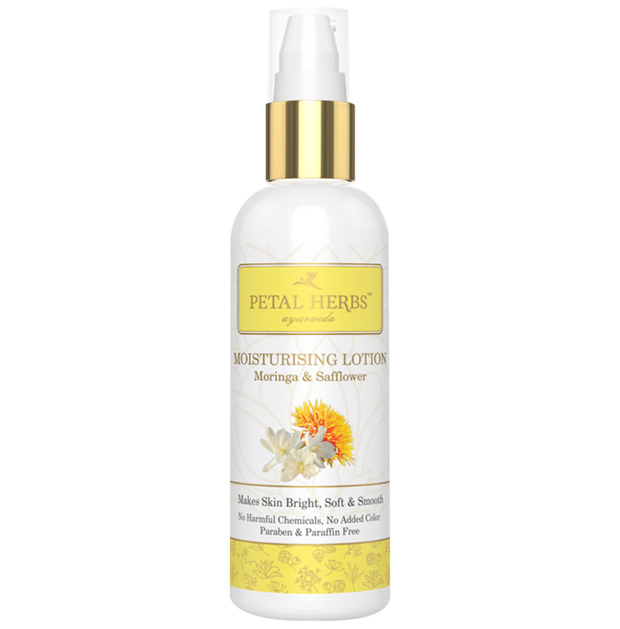 Petal Herbs Ayurveda Moisturising Lotion helps to reduce skin damage and lightens the dark spots. It is paraben, paraffin-free. For all skin types. | Key Ingredients: Moringa Safflower Tamarind seeds ext. Aloe vera Mulethi (Licorice) Wheat Germ Olive Leave Ext. Vitamin-E Kokum Butter | Key Benefits: Lubricates and tones the skin Reduces skin damage and lightens the dark spots Makes skin bright, soft and smooth It is paraben, paraffin and alcohol-free No harmful chemicals and no added colour For all skin types For men and women | Directions For Use: Apply Moringa and safflower moisturizing lotion over the face & neck and massage gently. | Safety Information: