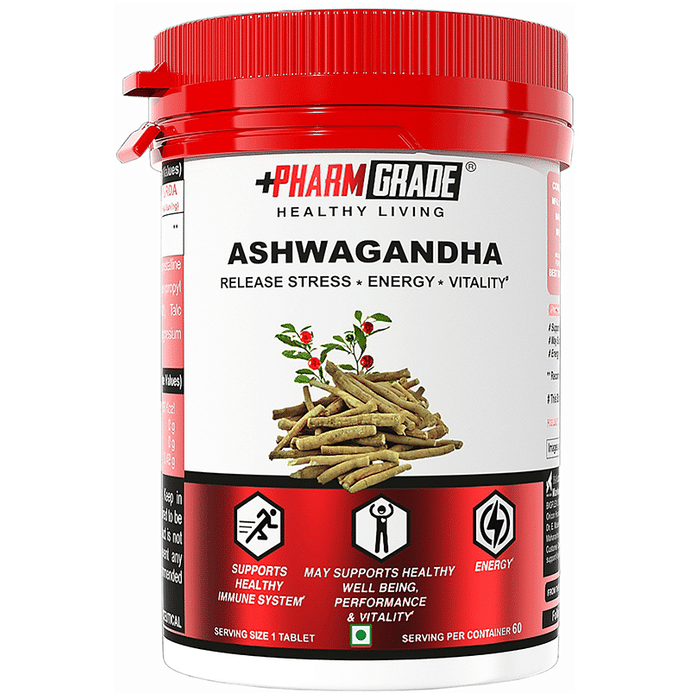 Pharmgrade Ashwagandha Tablet is usually used to cope with stress. It is also used as an "adaptogen" for many other conditions. It can assist with vigour and vitality management. It relaxes the body and helps to alleviate tiredness. It is loaded with antioxidants and prevents oxidative stress damage. | Key Ingredients: Ashwagandha | Key Benefits: It contributes by enhancing the strength and durability of the heart and lung while increasing energy The adaptogenic action of Ashwagandha has been demonstrated to help combat physical and mental stress and helps to enhance general health The nervous system is strengthened and helps the users to better deal with stress by increasing their stress threshold | Directions For Use: Take 1-2 servings daily or as directed by the physician. | Safety Information: Read the label carefully before use Keep out of reach of the children Store in a cool dry place