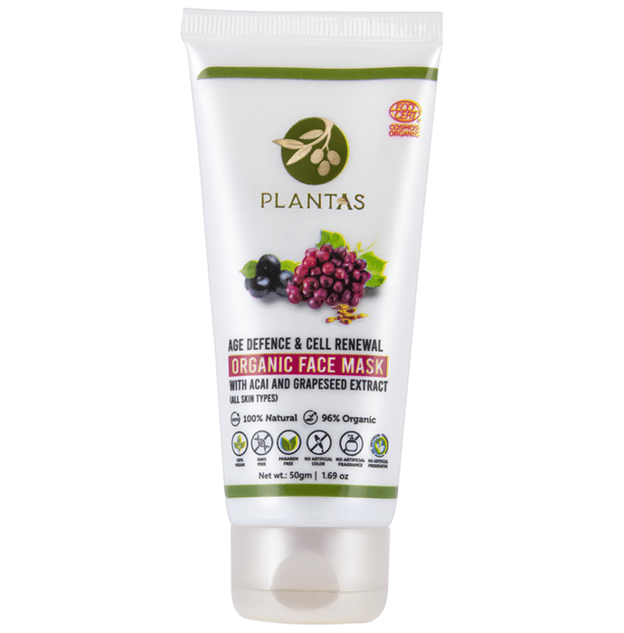Plantas Age Defence and Cell Renewal Organic Face Mask contains acai, grapeseed, sage and mulberry extracts, which can help boost collagen, delay and reduce fine lines and wrinkles, and remove dead cells. Applying this mask regularly can help to give a clear, fresh, rejuvenated, soft and bright skin. It can help bring lost radiance and elasticity to the skin and over 95% of the ingredients are organically sourced. | Key Ingredients: Butyrospermum parkii butter (refined shea butter) Cetearyl olivate Sorbitan olivate Glycerin, Purified Water Vitis vinifera (grape seed extract) Euterpe oleracea (acai extract) Salvia officinalis (sage extract) Morus indica (mulberry extract) | Key Benefits: This organic face mask can help boost collagen production and reduce fine lines and wrinkles It can also help remove dead cells and give rejuvenated and bright skin Made with saffron extracts and acai that can help removes excess oil, dirt, and impurities from the skin 95% of the ingredients are sourced organically 100% natural ingredients Vegan product, free of GMOs, parabens, phthalates, pesticides, and mineral oil No artificial colours, fragrances, or preservatives added Cosmos organic is certified by Ecocert Greenlife | Direction For Use: After cleansing, apply to a dry face avoiding the eye and lip area Leave it for 15 minutes Gently massage with fingertips while rinsing with lukewarm water Use twice a week For best results, use along with Plantas scrub | Safety Information: Read the label carefully before use Store in a cool and dry place, away from sunlight Keep out of reach of children This product is not intended to cure or prevent any diseases