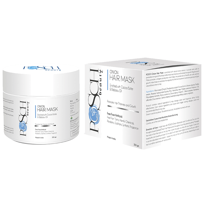Posch Onion Hair Mask boosts enzyme-like antioxidants and encourages hair growth. The onion's sulphur nourishes your hair strands and stimulates hair follicles that prevent hair loss and encourage hair growth. Posch Onion Hair Mask helps preserve your hair from environmental harm. | Key Ingredients: Onion Cocoa Butter Babassu Oil | Key Benefits: Onion has sulfate that reduces thinning of hair and regenerates the hair follicles. By nourishing your hair follicles with nutrients it makes your scalp healthier It fights bacteria and fungus to affect your hair or scalp, it regulates hair growth by enhancing blood circulation Cocoa Butter is good for hair and skin. It helps to provide soft and healthy hair growth. With its softening and healing properties, it makes your hair shiny and healthy Cocoa helps to moisturize your hair, strengthens its roots, repairs the damaged hair and prevents hair breakage Cocoa butter replenishes the oils lost because of chemical processes and makes the hair more manageable Babassu Oil is rich in fatty acids and antioxidants. It boosts the health of your hair and skin by moisturizing them Babassu oil reduces the greasiness of your hair and also has antibacterial and anti-inflammatory properties Its antioxidants prevent cellular damages caused by free radicals | Directions For Use: Step 1: Put your hair down the middle and start applying it from the parts and on your scalp Step 2: Massage your head with your fingers so that it reaches the scalp Step 3: Tie your hair up. Cover your hair with a towel or a shower cap Step 4: Leave it for 20 minutes Step 5: Rinse your hair with regular shampoo and conditioner | Safety Information: Read the label carefully before use Keep out of reach of the children Store in a cool dry place | FAQs | Q. Who can use Posch Onion Hair Mask? Posch Onion Hair Mask is suitable for both men and women. From teenagers to adults, everyone can use Posch Onion Hair Mask for healthy hair growth. | Q. How many days a week can you use Posch Onion Hair Mask? You can use Posch Onion Hair Mask 1 to 2 days per week. During winters, you may increase it. | Q. Is Posch Onion Hair Mask suitable for all types of hair? Posch Onion Hair Mask is suitable for all types of hair. Generally, it is useful for chemically treated hairs or damaged hairs for treatments. | Q. Is the Babassu Oil ingredient in Posch Onion Hair Mask suitable for people with oily hairs? The Babassu Oil ingredient in Posch Onion Hair Mask is a lightweight oil. You will not feel oily and, it acts as a conditioner. | Q. Does Posch Onion Hair Mask solve dandruff problems? Posch Onion Hair Mask can reduce your dandruff problems. The onion has antifungal and antimicrobial properties that fight dandruff and clears your scalp. It even reduces any types of inflammation issues and makes your hair shinier and thicker.