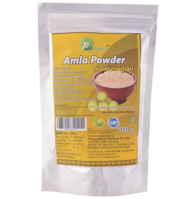 Pragna Amla Powder is an ayurvedic amla powder. It provides various benefits to the body. | Key Ingredients: Amla | Key Benefits: Amla is rich in vitamin C that acts as an antioxidant and helps to fight against oxidative damage It helps to fight the common cold It improves eyesight It helps to build up immunity It helps to control hair fall and improves skin health It relieves joint pain and problems It improves metabolic activity and digestive process | Directions for Use: Take 1 teaspoon amla powder with 50 ml water twice in a day with empty stomach. | Safety Information: Read the label carefully before use Keep out of the reach of children Store in a cool and dry place, away from sunlight Do not exceed the recommended dosage If pregnant or breastfeeding, ask a physician before use Do not use if the seal is broken