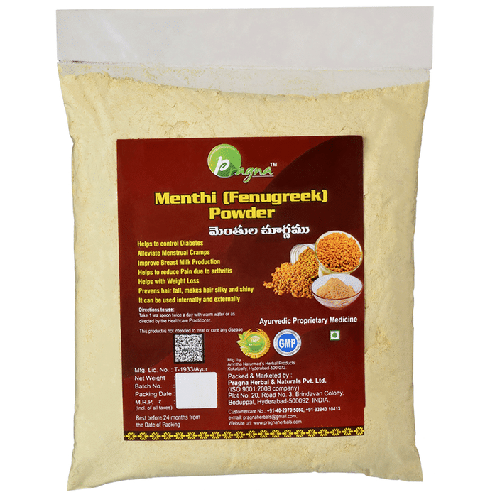 Pragna Menthi (Fenugreek) Powder helps in controlling Diabetes.It not only alleviates menstrual cramps but also helps in improving production of breast milk .It is also useful in reducing pain due to arthritis.It helps in preventing hair fall and makes the hair silky and shiny. | Key Ingredients: Fenugreek | Key Benefits: Controls diabetes Alleviate menstrual cramps Helps in healthy weight management Helps to reduce pain due to arthritis | Directions for use: Take 1 teaspoon twice a day with warm water | Safety Information: Read the label carefully before use Do not exceed the recommended dose Store in a cool dry place away from sunlight and heat Use under medical supervision