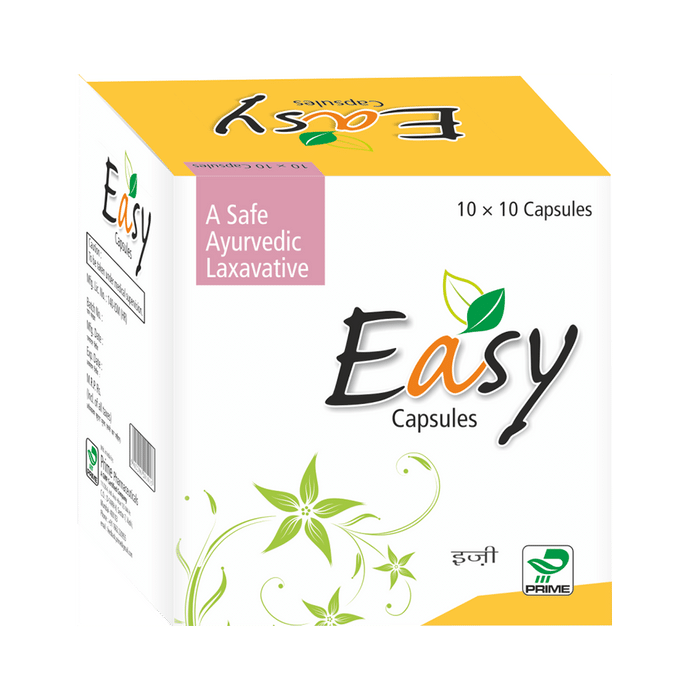 Prime Easy Capsule is a safe Ayurvedic laxative that promotes regular and strain-free bowel movement. It can help constipation, diverticulosis, anorectal disease and irritable bowel syndrome. | Key Ingredients: N/A | Key Benefits: It serves as a safe laxative to provide relief from constipation It can help with mild as well as chronic constipation It helps in the prevention of abdominal diseases caused by difficulty in bowel movement It helps to regularise bowel movement | Directions For Use: Use as directed on the label | Safety Information: Read the label carefully before use Do not exceed the recommended dose Store in a cool, dark and dry place
