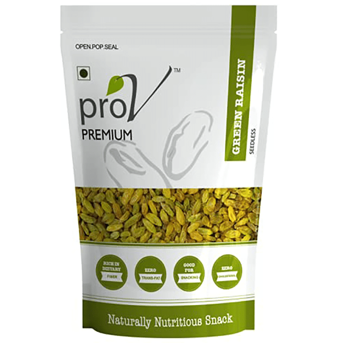 Prov Premium Green Raisins These naturally dried green raisins are free of artificial colours and preservatives. Raisins are high in vitamins and minerals, both of which are beneficial to one's health. They're also low in cholesterol and fat, high in antioxidants, and high in fibre. Green raisins are abundant in calcium and iron, two minerals that are important for bone health. They're dried fruits that can be eaten as a snack or added to a variety of sweet dishes, granola combinations, and mixed trials. | Key Ingredients: Green raisins | Key Benefits: It could regulate the sugar content in your nerves Raisins are extremely beneficial in keeping your bones healthy and strong It helps in healthy digestion and helps you have smoother bowel movements Raisins are extremely rich in antioxidants that are vital in cleaning up your cells and increasing the flow of blood in your body | Directions For Use: Use as directed on the label or as advised by your healthcare provider | Safety Information: Read the label carefully before use Store in a cool and dry place away from direct sunlight Keep out of reach of children