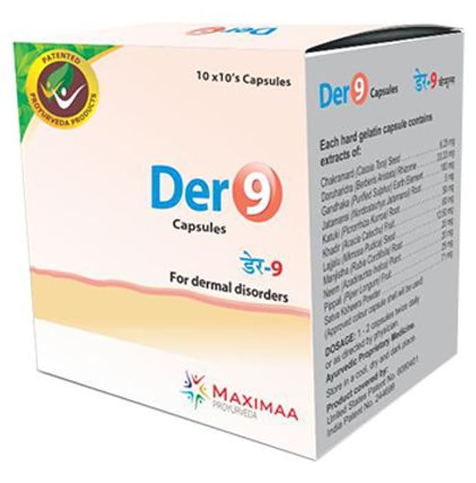 Proyurveda Der 9 Skin Care Capsule Proyurveda Der 9 Capsule is created with the perfect blend of probiotics and special ayurvedic herbs is helpful in treating various skin disorders and reduces itching,helps in reducing skin inflammation, allergies and rashes, effective blood purifier. It contains Chakramarala Beej, Daruharidra, Jatamansi, Katuki, and Lajjalu. Key benefits of Proyurveda Der 9 capsule: Helpful in treating various skin disorders and reduces itching. Possesses anti-inflammatory and antiseptic action. Helpful in auto immune diseases like vitiligo and psoriasis. Astringent property useful in faster healing. Effective blood purifier. Prevents skin dryness. It helps in bacterial & fungal infections dermatitis, eczema, urticaria, allergic & chronic disorders of skin. Direction of use: Take 1-2 capsules twice daily or as directed by the physician. Use under medical supervision.