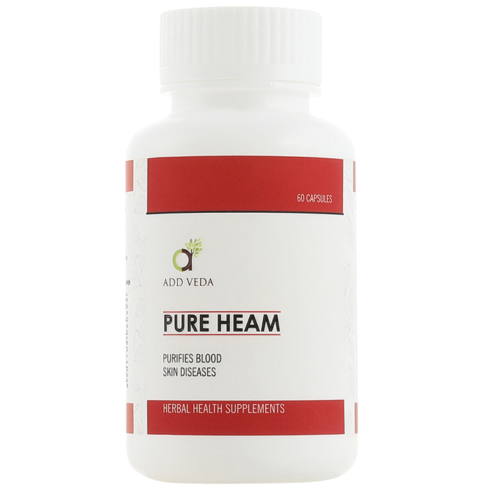 Pure Heam Capsule contains Curcuma Longa (Haridra), Trikatu, Trijata, Cinnamomum Tamala (Tvak Patra)), Embelia Ribes (Vidanga) (Karmighna), Operculina Turpethum (Trivrta), Triphla, Mesua Ferrea (Nagkesar), Cyperus Rotundus (Musta), and Calcined Lauha (Lauha Bhasma). Pure Heam is a 100% herbal blend of blood purifiers with the richness of Iron and other vitamins and minerals. It helps remove toxins from the blood naturally, detoxifying and rejuvenating your body. Its Ayurvedic ingredients ensure healthy liver functions, strengthen your immune system and keep your skin clean, supple and healthy. Pure Heam reduces the pitta dosha from your body, excess of which causes skin irritation and common infections. Benefits of Pure Heam Capsule: Helps treat acne and other skin related diseases Improves digestion and boosts immunity Provides relief from constipation Detoxifies harmful toxins from the body Has no side effects Direction for use: Two capsule twice daily preferably with one tablespoon of Goghrta (certified butter from cow milk) in luke warm milk only after meals. Use under medical supervision