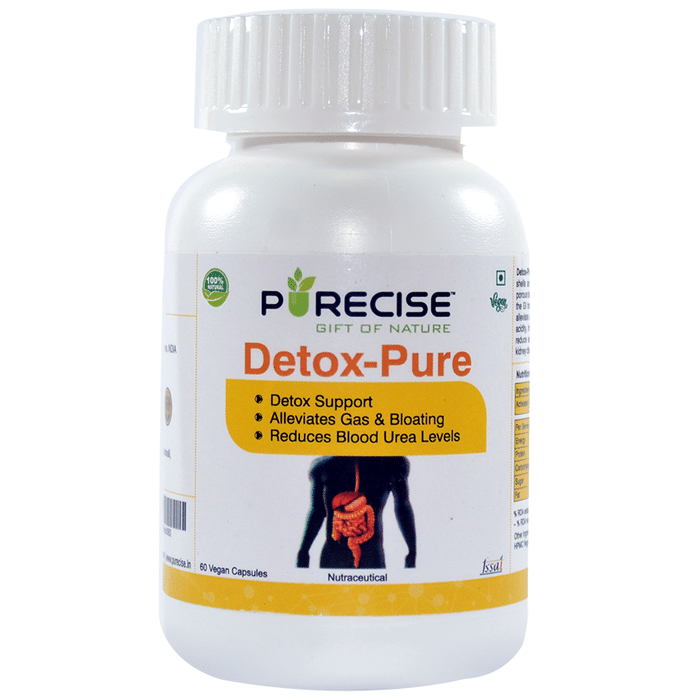 Purecise Detox-Pure Vegan Capsule comprises of activated charcoal powder that is manufactured from coconut shells and is historically used for good digestive function. The porous texture allows it to attract and capture toxins normally found in the GI tract and remove them from the body. Activated carbon can also reduce unpleasant gases and bloating produced by gas-producing meals, acidity, indigestion, IBS, a weak digestive system or the general digestive system. Excess BUN (Blood Urea Nitrogen) levels are also proven to be reduced, especially in people suffering from kidneys. | Key Ingredients: Activated Charcoal (Coconut Shells) 325 mg | Key Benefits: Activated carbon can reduce unpleasant gases and bloating produced by gas-producing meals Reduces acidity, indigestion, IBS and treats a weak digestive system or the general digestive system Excess BUN (Blood Urea Nitrogen) levels are also proven to be reduced, especially in people suffering from kidneys | Directions For Use: 1 to 2 capsules to be taken daily, preferably with a meal or as suggested by your healthcare professional Not to be used as a substitute for a varied diet | Safety Information: Read the label carefully before use Keep out of reach of the children Store in a cool dry place Not to exceed the recommended daily usage Not for medicinal use Pregnant or lactating women and people with known conditions and/or taking medications should consult a clinical practitioner before consuming this product
