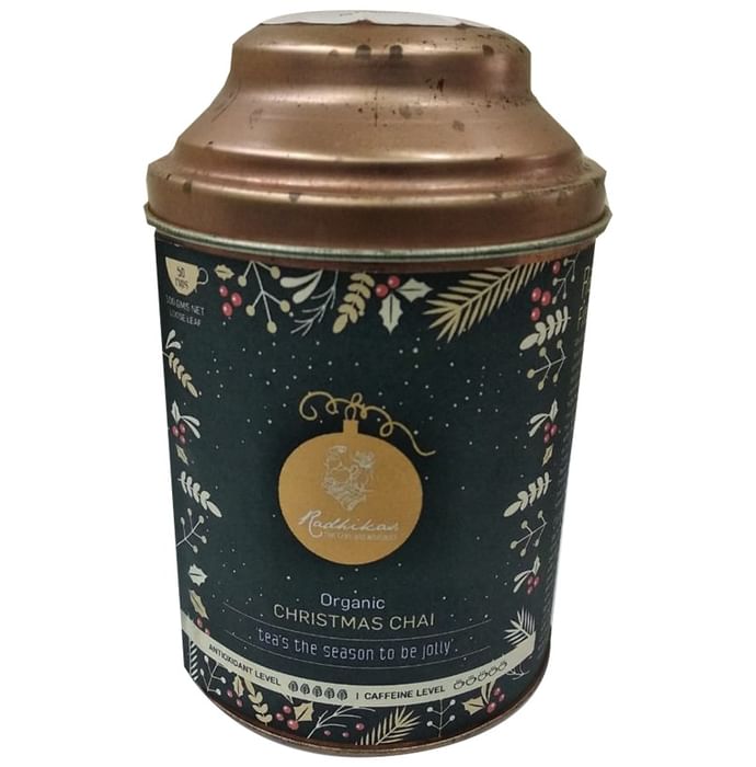 Radhikas Fine Teas Organic Christmas Chai Sip in the spirit of Christmas with a cup filled with hope and joy. Indulge in this bespoke plantation fresh brew made with the finest organic Assam leaf from the Jamguri gardens of the pristine Himalayas, seasoned for the season with an array of organic herbs and spices such as cloves, cardamom, fennel, cinnamon, ginger and liquorice. Handcrafted with love by our tea sommelier, this unique curation when mindfully brewed with your love and care, promises to turn everything naught-tea into nice. | Key Ingredients: Organic ginger Assam CTC Clove Cardamom Fennel Cinnamon Liquorice Black pepper | Key Benefits: Ginger accelerates glucose metabolism hence prevents diabetes and cardiac complications This organic tea doesn't play with sugar spikes, instead provides balanced rejuvenation The flavonoids help fight inflammation, bad cholesterol and are anti-carcinogenic It aids in the process of natural body detoxification and helps to keep the heart healthy Radhikas Fine Teas Organic Christmas Chai is formulated with love using herbal ingredients that stimulate the mind and benefit the overall health | Directions For Use: Use as directed on the label. | Safety Information: Read the label carefully before use Store in a cool and dry place away from direct sunlight Keep away from children Do not use if the seal is missing or damaged