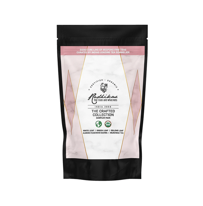 Radhikas Fine Teas Organic The Crafted Collection Tea Leaves White Leaf, Green Leaf, Oolong Leaf, Almond Kashmiri Kahwa, Mukhwas Tea Radhikas Fine Teas Organic The Crafted Collection Tea Leaves The crafted sampler pack is a trial pack for you, to try out our 5 bestsellers. These are premium, Darjeeling whole leaves that are Organic and pure. Simply tear it open and make two cups of Organic bliss per flavour. Once you have tasted all 5 flavours, you can buy the bigger pack of your choice from the Radhikas Fine Teas selection.