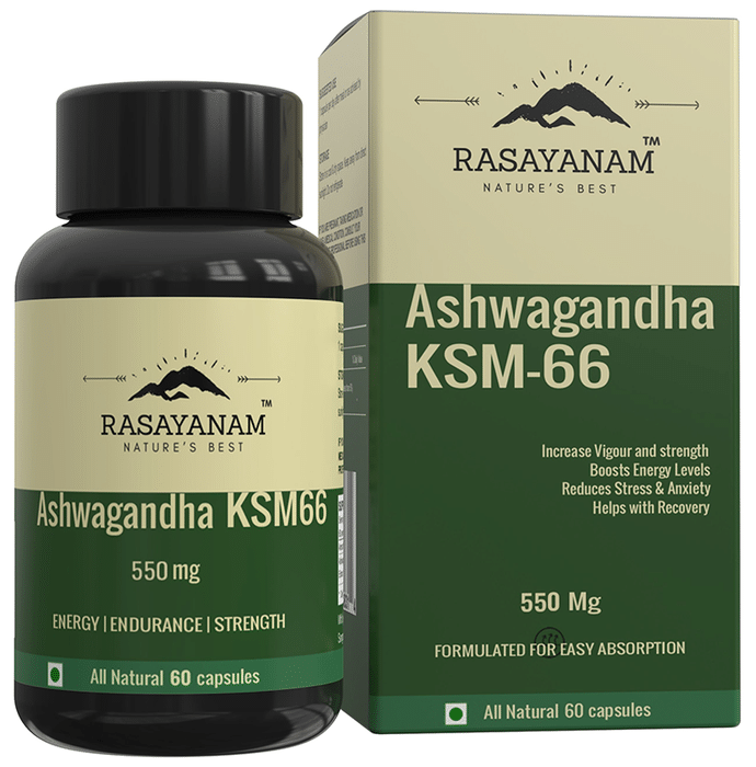 Key Ingredients of Rasayanam Ashwagandha KSM 66 550mg Capsule: Ashwagandha (Withania Somnifera, not less than 5%) Extract – 500mg | Key Benefits of Rasayanam Ashwagandha KSM 66 550mg Capsule Offers mental clarity Promotes proper brain functioning Boosts libido Provides relief from stress