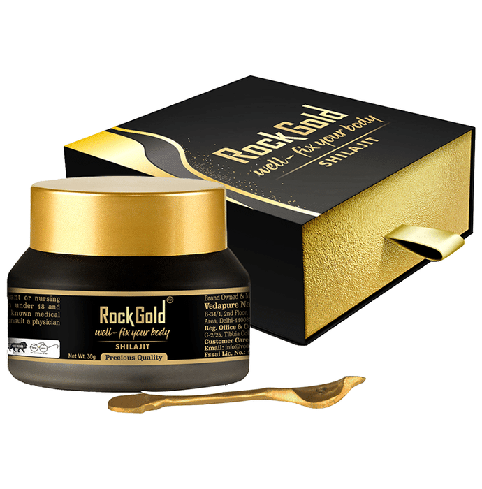 Rock Gold Shilajit Natural Source of Fulvic Acid and Trace Minerals improves strength, stamina and energy in men and women. It helps to provide a healthy body and mind. | Key Ingredients: Shilajit Kushta Nuqra Kushta Tila | Key Benefits: Reduce physical weakness and improves stamina Help to provide a healthy body and mind For enhancing the natural performance and helps in healthy ageing | Directions For Use: Take 500 mg or pea size of shilajit twice a day with lukewarm water/ milk or as directed. | Safety Information: Read the label carefully before use Keep out of reach of the children Store in a cool dry place