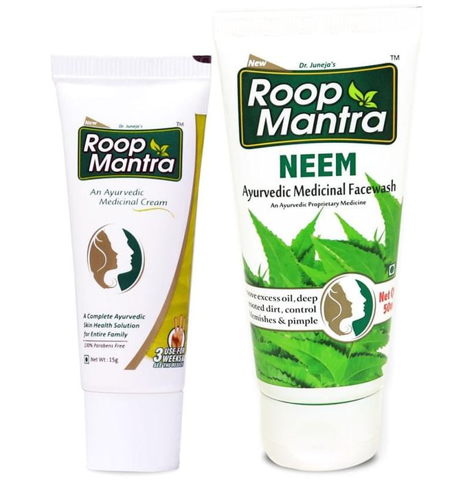 Roop Mantra Combo Pack of Face Cream 15gm & Neem Face Wash 50ml Roop Mantra Combo Pack of Face Cream 15gm & Neem Face Wash 50ml includes Roop Mantra Face Cream which aids in rejuvenating and hydrating the skin. It is useful in the case of blemishes, pimples, acne, blackheads. In addition to this, Roop Mantra Neem Face Wash helps to removes excess oil, clears pimples and acne.