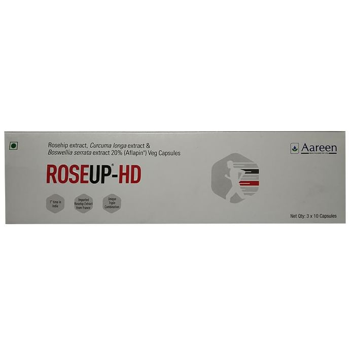 Roseup-Hd Capsule is a supplement mainly prescribed for joint and cartilage disorders like osteoarthritis. It has excellent anti-inflammatory as well as pain killer properties that are used to maintain the bone and muscle health of the body. It is indicated in joint-related problems. | Key Ingredients: Rosehip Extract Curcuma longa extract Boswellia serrate extract Lubricant (magnesium stearate) Anti-caking agent (silicone dioxide) Shell made of Hydroxypropyl methylcellulose | Key Benefits: Rosehip is a dietary supplement for joint health It can alleviate symptoms of arthritis if taken daily Alleviates joint pain through its immunosuppressive effects Potent anti-inflammatory and immunosuppressive agent Indicated in the condition in which bones become weak and brittle It is used to strengthen the bones and alleviate the joint pain Supports and maintains the integrity of cartilages | Directions For Use: Take Rose up-Hd Capsule as directed by the physician. | Safety Information: Read the label carefully before use Do not exceed the recommended dose Keep out of the reach of children Store in a cool and dry place Should be protected from sunlight