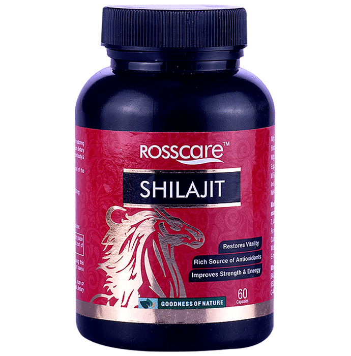Rosscare Shilajit Capsule contains Shilajit extract with no preservatives and colours. Shilajit as a dietary supplement may also improve heart health and reduce symptoms of Chronic Fatigue Syndrome, and restore energy. Shilajit tablets provides significantly higher testosterone level in men. Shilajit 500mg capsules may also protect against free radicals and cellular damage, helping against aging. | Key Ingredients: Shilajit Extract (Asphaltum) Powder 500 mg ( 2.5% Fulvic Acid) | Key Benefits: Restores vitality Rich source of antibiotics Improves strength and energy Helps reduce stress Increases stamina and endurance | Directions For Use: One capsule twice a day or as directed by the physician | Safety Instructions: Read the label carefully before use Store in a cool dry place away from direct sunlight Keep out of reach of the children Pregnant, nursing women or individuals taking any medications, consult the doctor before use No artificial colours, flavours or preservatives added, no chemical solvents Use under medical supervision