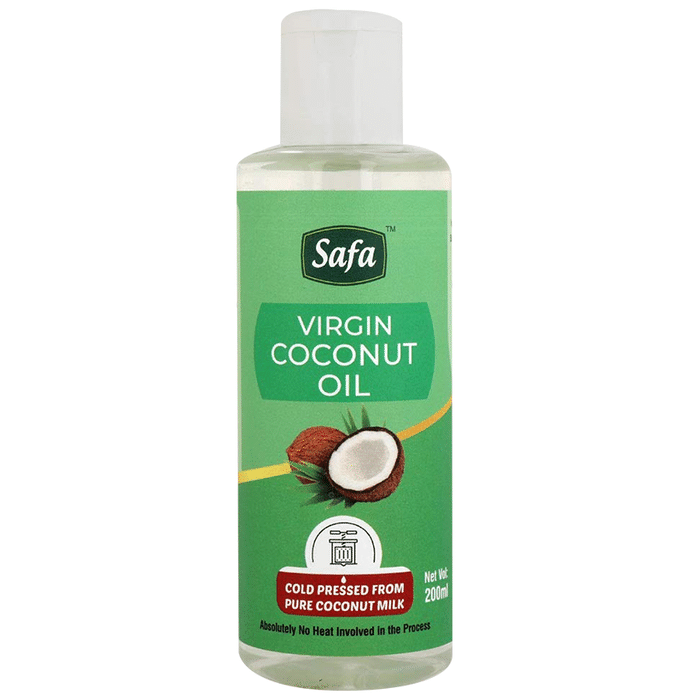 Safa Virgin Coconut Oil is raw, pure and cold-pressed oil that is a unique combination of fatty acids and can have positive effects on health including fat loss and improved functioning of the brain. It is organic in nature and is one of the highest quality coconut oil. The oil is centrifuged to get the highest quality and is very good for a healthy metabolism. It is very beneficial for the heart and helps in the healthy functioning of the thyroid and endocrine glands. | Key Ingredients: Coconut oil | Key Benefits: It is rich in vitamins, minerals, and antioxidants It is a very good moisturiser that makes the skin soft and supple It has anti-fungal, anti-viral, and anti-bacterial properties which make it an excellent oil for massage It prevents any irritation from rashes It is very beneficial for the heart and helps in the healthy functioning of the thyroid and endocrine glands | Directions For Use: Use as directed on the label. | Safety Information: Read the label carefully before use Store in a cool and dry place away from direct sunlight Keep out of reach of children