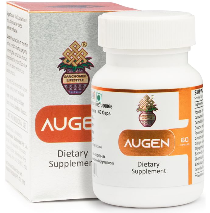 Sanchomee Augen Capsule is a combination of natural herbs that helps alleviate and manage eye problems like dryness and itching. It contains a blend of powerful ingredients like marigold, turmeric, green tea, carrot and grape seed extract that significantly benefits eye health. | Key Ingredients: Tagetes erecta Curcuma longa Camellia sinensis Daucus carota Foeniculum vulgare Grape seed extract Ginkgo biloba | Key Benefits: Marigold (Tagetes erecta) protects vision by guarding the delicate tissues of the eyes against UV rays, ageing and oxidative damage Turmeric (Curcuma longa) acts as an antiseptic and reduces oxidation of the eye lens Green tea (Camellia sinensis) helps in reducing dark circles and puffiness Carrot (Daucus carota) maintains a clear and sharp vision and reduces the risk of night blindness Grape seeds extract excellent for all-round health of the eyes | Directions For Use: Use as directed on the label | Safety Information: Read the manual carefully before use Store in a cool, dry place away from direct sunlight Keep out of reach of children